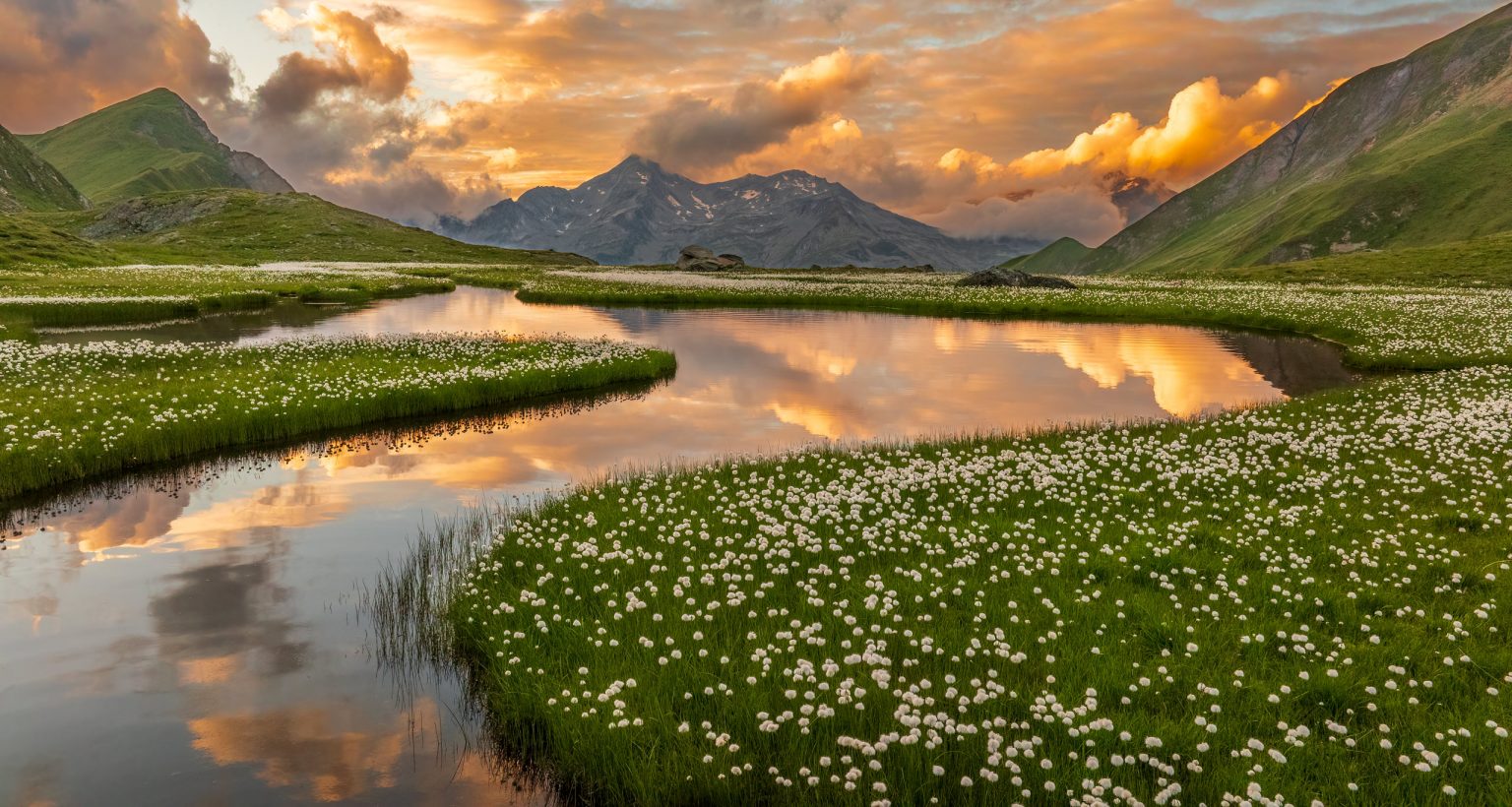 The cotton grass unfolds its delicate splendor, a fleeting bloom that fades as swiftly as it began. In a hidden wetland, high above 2000 meters, where glacier water silently winds its way, a world of its own awakens.