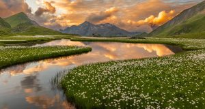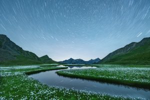 Dolcemente avvolto nell’oscurità della notte, lo sguardo si posa su un tappeto di delicata cinciarelle, che come un sogno fugace decora le alture di una zona umida sopra i 2000 metri. Acqua immobile, nutrita dai ghiacciai delle montagne, riflette le cime lontane e porta il tempo nelle sue profondità immobili.