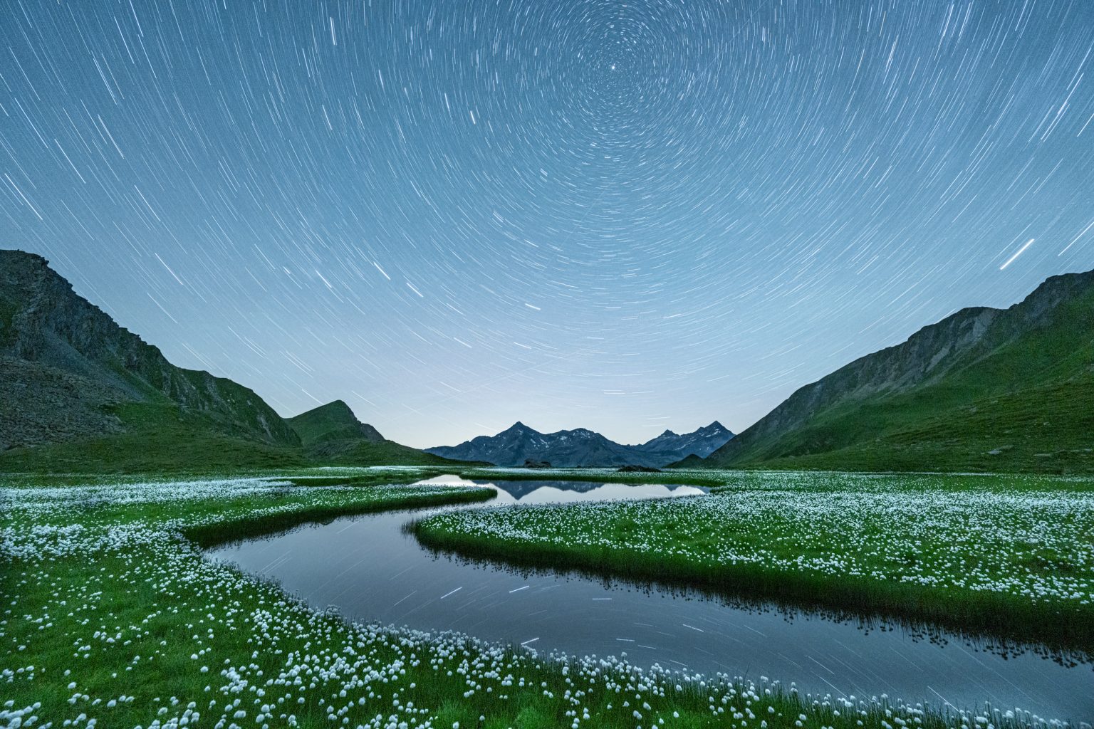 Gently wrapped in the darkness of night, the gaze wanders over a carpet of delicate cotton grass, adorning like a fleeting dream the heights of a wetland above 2000 meters. Still water, nourished by the glaciers of the mountains, reflects the distant peaks and carries time in its motionless depths.