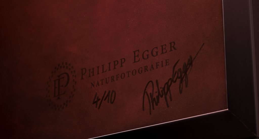 > Exclusive nature calendar in A2 landscape (59.4 × 42 cm) with 16 refined pages. Strictly limited to 100 copies, each individually numbered and hand-signed by Philipp Egger. Presented in matte black with a golden wax seal – perfect for gifting.