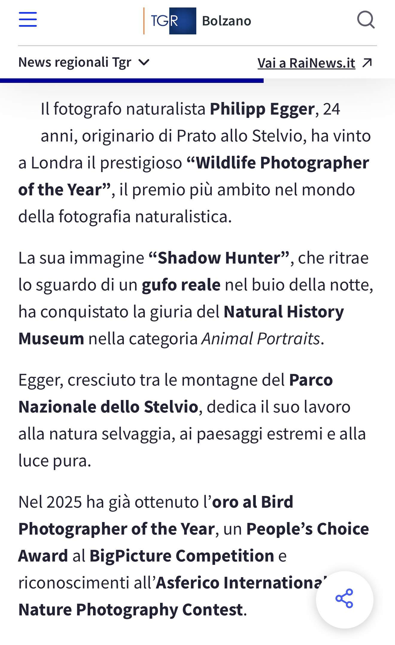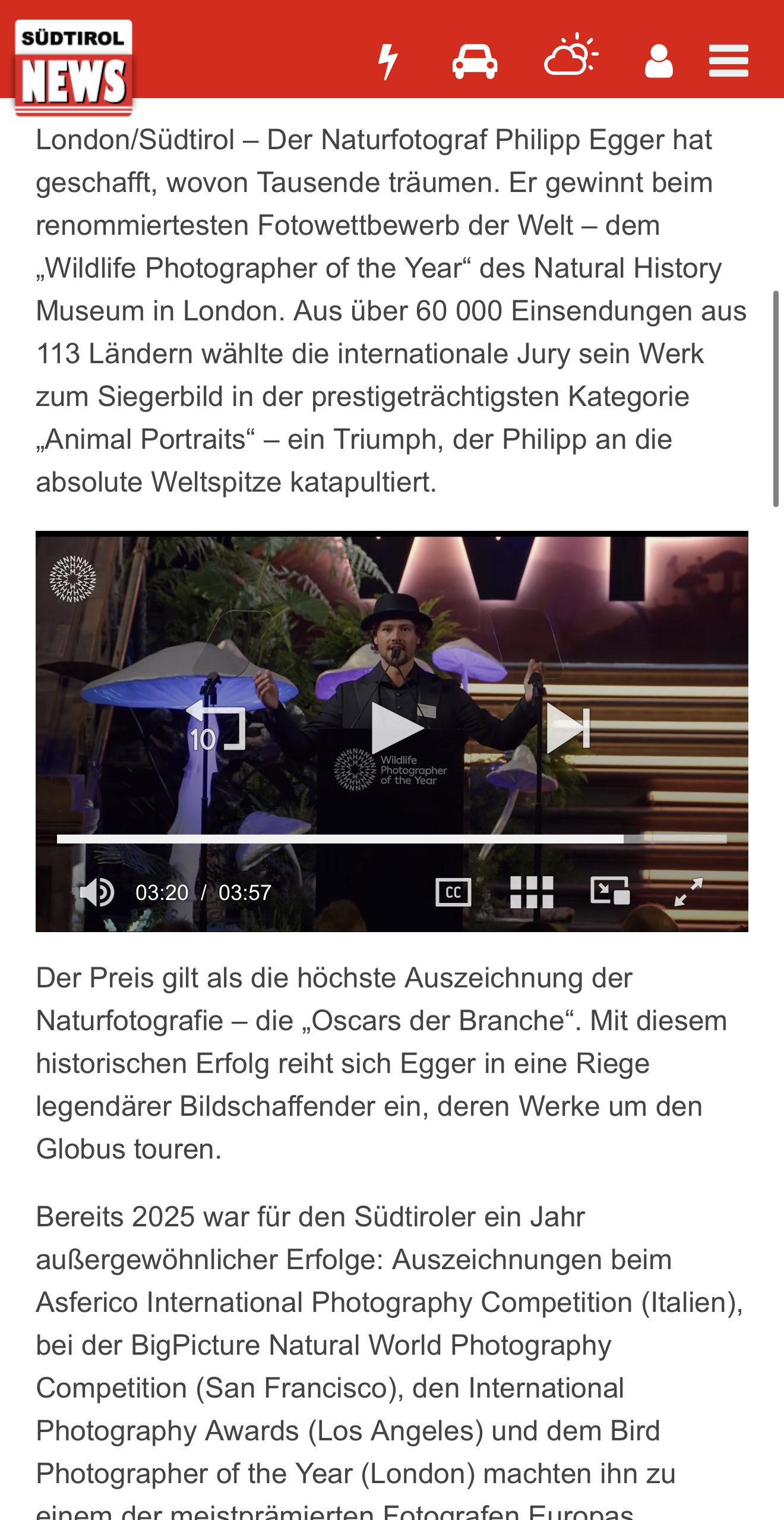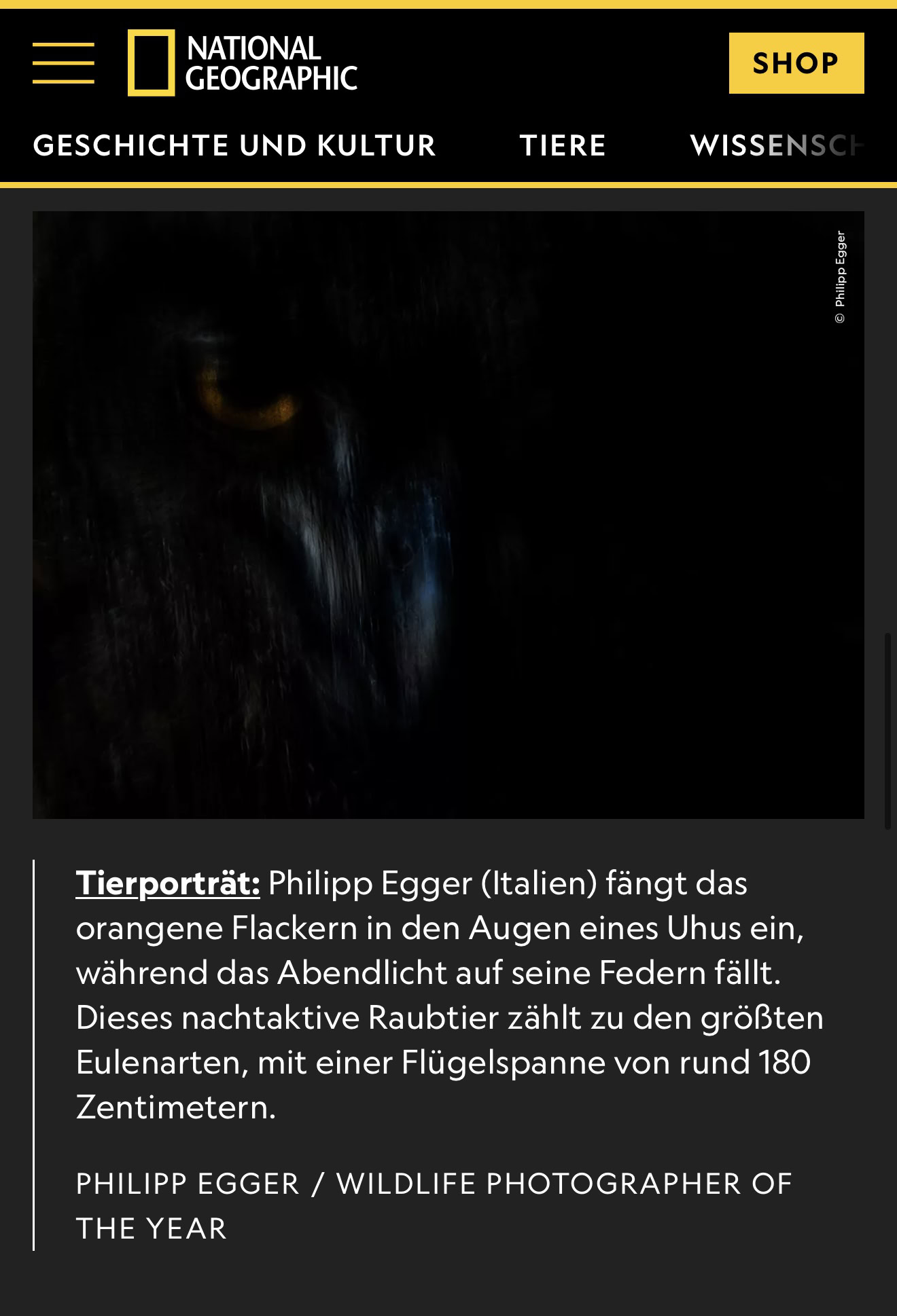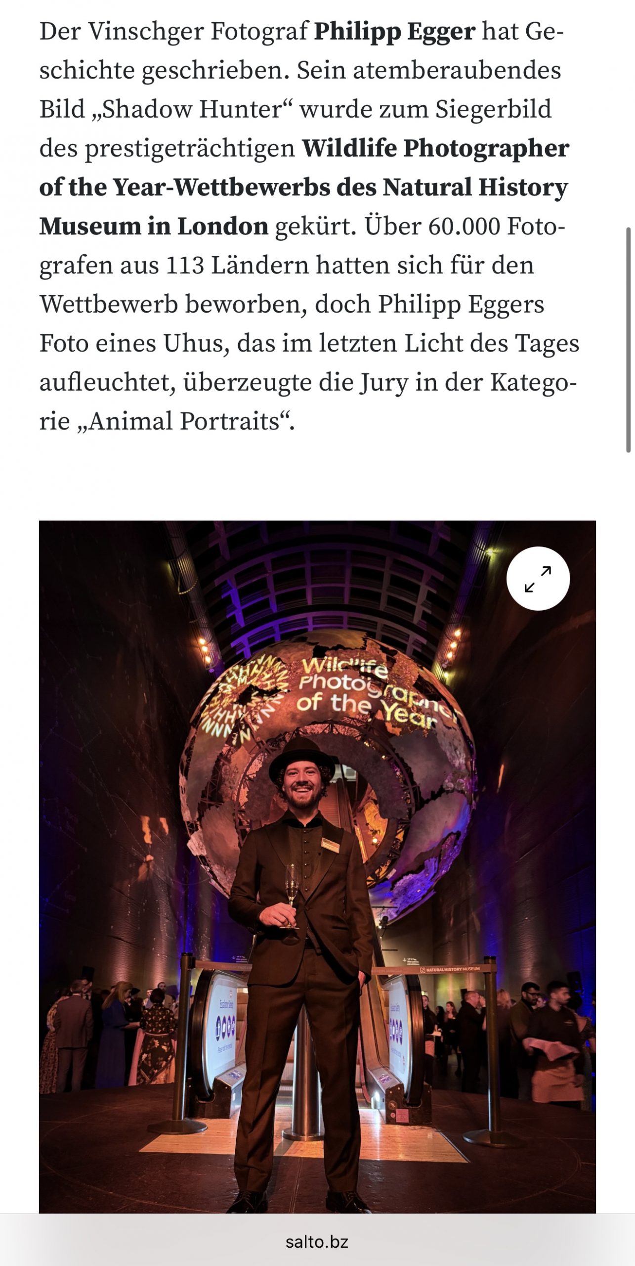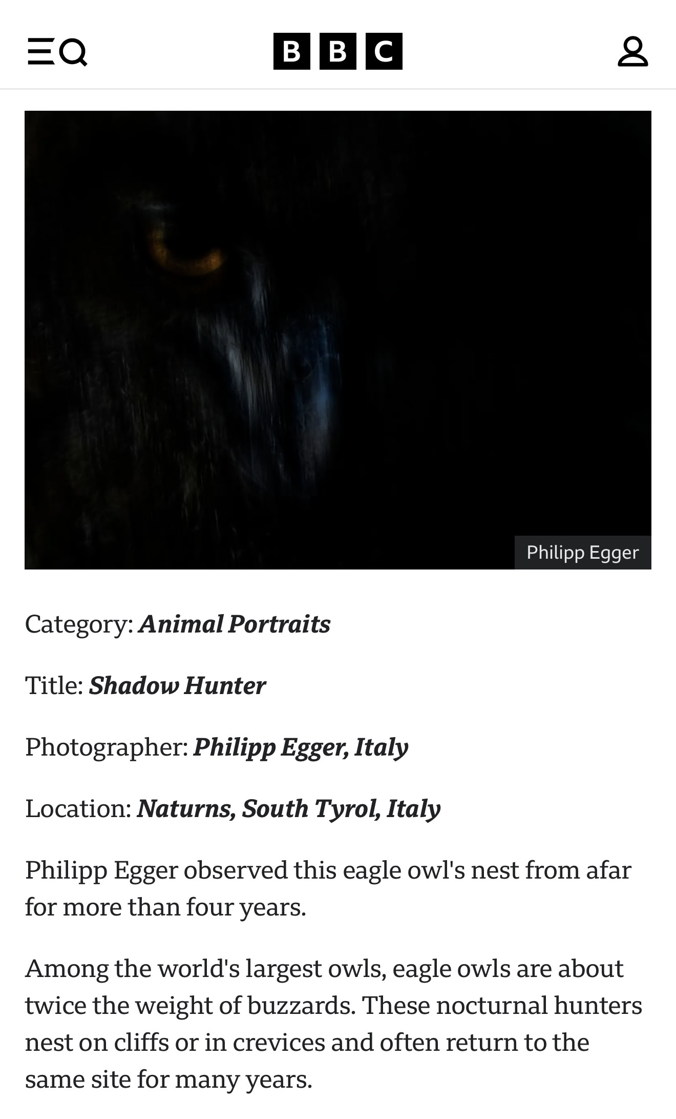 Questo lavoro è stato scelto come vincitore del premio Wildlife Photographer of the Year nella categoria "Ritratti di animali" - il concorso di fotografia naturalistica più prestigioso al mondo.