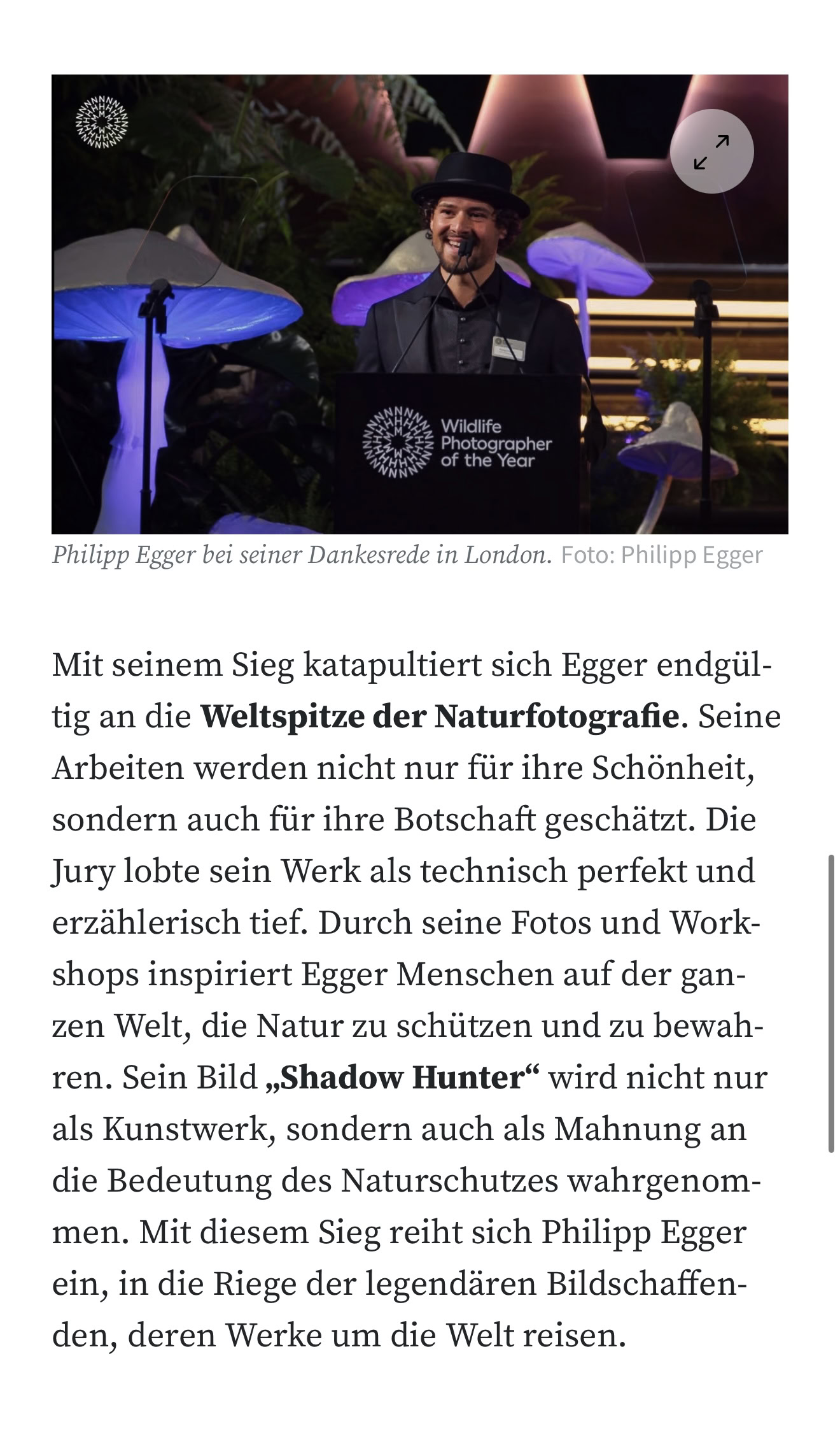 Meine Werke entstehen mit Hingabe, Geduld und körperlicher Präsenz. Ich verbringe Wochen, Monate, manchmal Jahre an einem Ort, bevor sich der Moment zeigt, in dem alles stimmt. Diese Tiefe spiegelt sich in meinen Fotografien und Filmen – sie wurden weltweit ausgestellt, ausgezeichnet und in den renommiertesten Wettbewerben der Welt geehrt. Auch als Kameramann für Dokumentationen wie ORF-Universum bringe ich die verborgene Poesie der Wildnis auf die Leinwand.