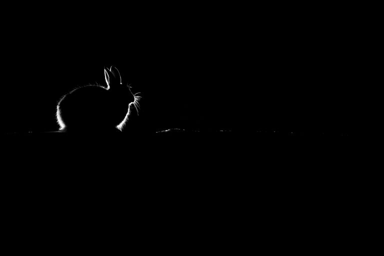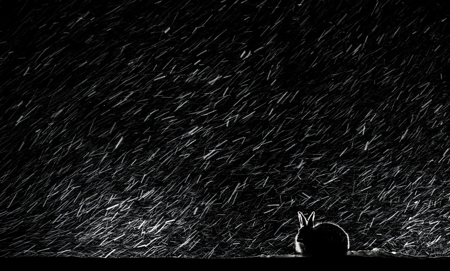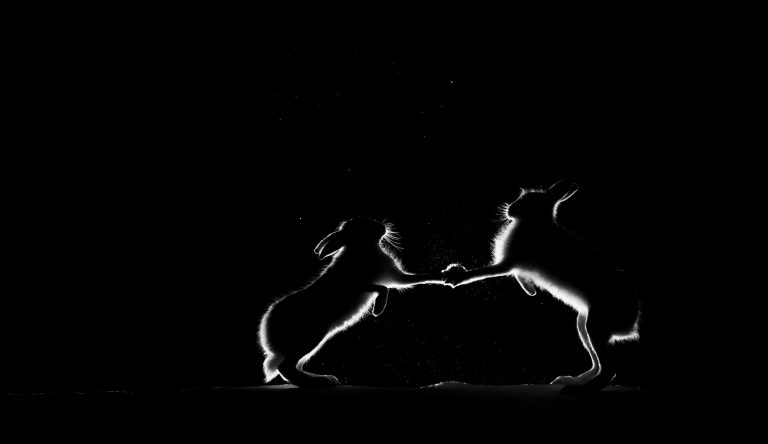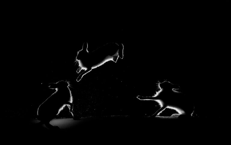 Per dare vita all’immagine, ho sviluppato una tecnica speciale. Dietro la collina ho posizionato dei flash, che ad ogni scatto creavano una delicata retroilluminazione. Nella notte completamente buia e con un’esposizione volutamente ridotta, la luce sembrava il respiro del chiaro di luna che accarezza le lepri. Le loro sagome apparivano leggere e misteriose contro il nero profondo della notte, poco più che ombre nella tenebra.